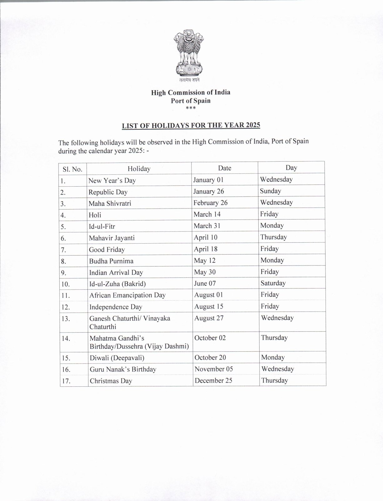 LIST OF HOLIDAYS FOR THE YEAR 2026